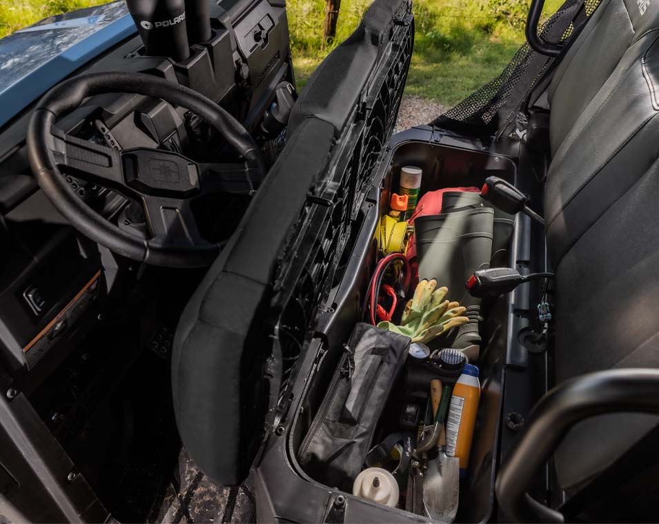 - Gas Assist Dump Box, Single Latch Tailgate, Rear-mounted Fiberglass Insulated Exhaust System, Standard In-dash SAE Charge Port, 575 CCA Battery, 660W Charging System (Stator), 48.4 Gal. Onboard Storage with Enclosed Dash Bins and Integrated Cell-phone Holder, Sealed Suspension Bushings and Wheel Bearings, Full Coverage Steel Front Bumper with Integrated Winch and Plow Mounts, Full Coverage Skid Plate, Premium Body Panels, Premium Cut & Sew Seats, Polaris Pulse Electrical System (3 position), USB Charging Port, Front Stabilizer Bar, Rear Wheel Liners